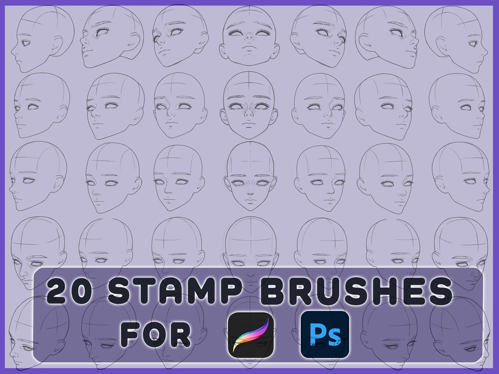 • 20 Female Head Stamp brush for Procreate and Photoshop.